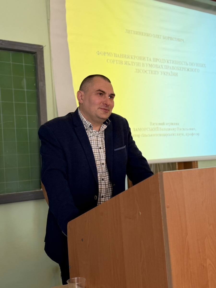 14 квітня 2026 року на розширеному засіданні кафедри плодівництва і виноградарства відбулася публічна презентація дисертаційної роботи ЛИТВИНЕНКА Олега Борисовича на тему: «Формування крони та продуктивність імунних сортів яблуні в умовах Правобережного Лісостепу України», поданої на здобуття ступеня доктора філософії в галузі знань 20 Аграрні науки та продовольство за спеціальністю 203 Садівництво та виноградарство.