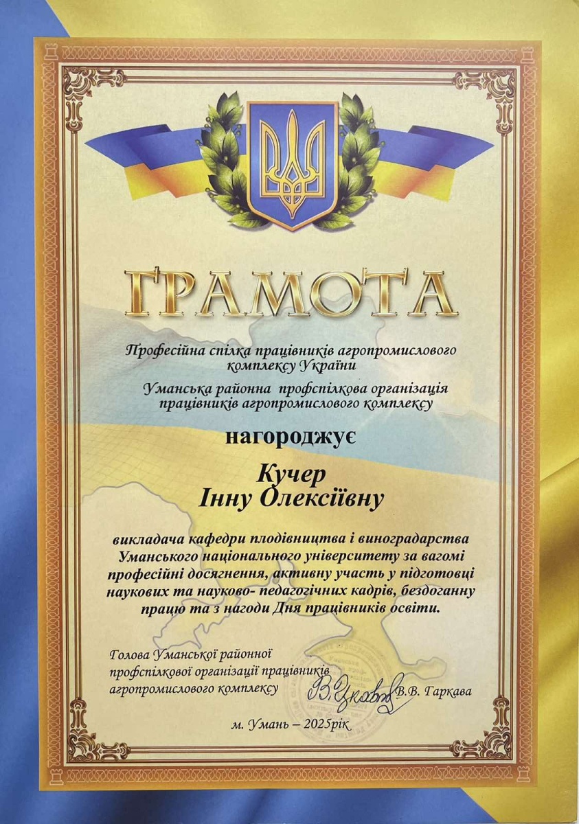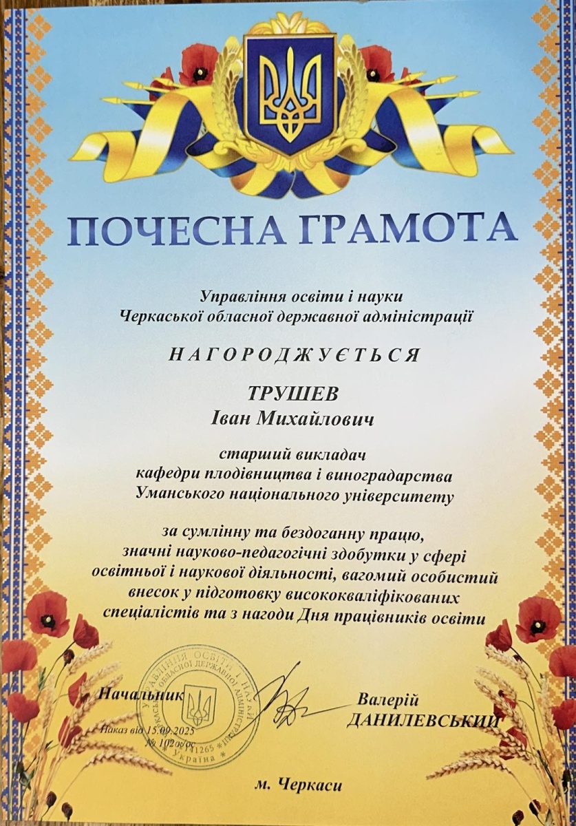 У переддень Дня працівників освіти України за сумлінну працю, значні науково-педагогічні здобутки у сфері освітньої та наукової діяльності, а також вагомий особистий внесок у підготовку висококваліфікованих спеціалістів грамоти отримали старші викладачі кафедри плодівництва і виноградарства Уманського національного університету: Іван ТРУШЕВ та Інна КУЧЕР.